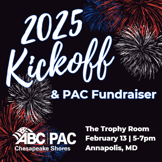 Join ABC Chesapeake Shores as we kickoff the new year at our annual 2025 Kickoff Event & PAC Fundraiser at The Trophy Room (located inside the Graduate Annapolis Hotel) in Annapolis, MD! Hear about updates regarding the predicted political landscape for 2025 and what ABC Chesapeake Shores has planned for the year! Attend this event and sign up for the coveted PAC name badge to have at every event in 2025 (all contributions go towards ABC-PAC).Special Invited Guests Include:ABC National President & CEO, Michael BellamanABC National Chair of the Board of Directors, David PughABC National Immediate Past Chair of the Board of Directors, Buddy HenleyABC National Senior Director of Political Affairs, Melanie PfeiffenbergerABC National Senior Director of State & Local Affairs, Brandon RayABC National Director of Legislative and Political Affairs, Vance WalterMore to be announced soon!Registration Includes: Heavy hors d'oeuvres and two drink tickets per person for beer, wine, or a crush. Cash bar will be available for additional purchases.Member Registration: $90 per personSponsorship Available!Bar Sponsor (unlimited) $350Includes cobranded signage at the bar