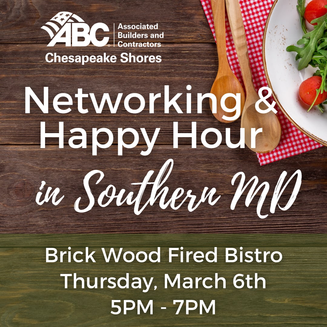 Join ABC Chesapeake Shores for a Networking & Happy Hour at Brick Wood Fired Bistro in Prince Frederick, MD! Reconnect with familiar faces and meet new members at this cozy, local favorite.Member Pricing: $65 per personProspective Member Pricing: $95 per personRegistration Includes: Heavy hors d'oeuvres and (2) drink tickets for beer or wine.Member Companies RegisteredAtlantic Hardware SupplyBrogan & CompanyCedar Lane ExcavationCMI General ContractorsCroessmann & Westberg, P.C.DeVere InsulationDiversified Site WorksHarkins BuildersHWP InsuranceJESCOKelly Generator & EquipmentL&L EnterprisesMarsh McLennan AgencyMobile Video GuardNorthside Steel FabricatorsRCM&DReliable Contracting CompanyScheibel ConstructionSMI CompaniesSpring Contracting GroupStuart ContractorsW.M. Davis Email ahughes@abc-chesapeake.org for details or reservation. To receive all sponsor benefits, commitments must be received by February 27, 2025. Registration constitutes a financial commitment. For a full refund, cancellations will be received up to 72 hours in advance; substitutions can be made at any time.
