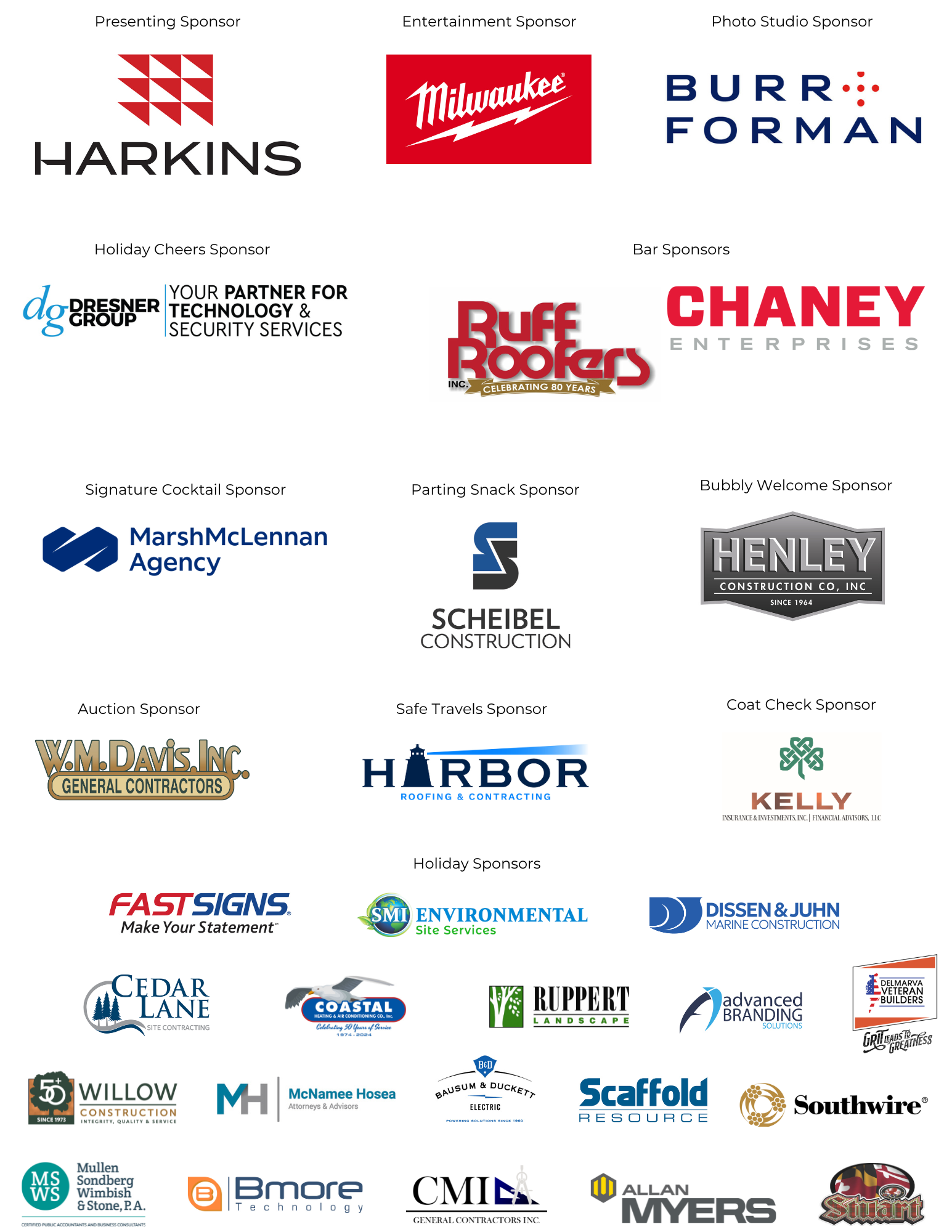 Advanced Branding Solutions Alex Brown Wealth Management Allan Myers Annapolis Exteriors Bausum & Duckett Electric BGC Bmore Technology Brogan & Company Burr & Forman Chaney Enterprises Coakley & Williams Construction Coastal HVAC Croessman & Westberg Delaware Elevator Delmarva Veteran Builders Diversified Site Works Dresner Group FastSigns of Annapolis Ferguson Trenching Company Gilbane Building Company Granix Harbor Roofing & Contracting Harkins Builders Henley Construction Honorary Member Club | James River Equipment Keller Brothers Kelly Insurance & Investments L.R. Willson & Sons Lawrence Law Marsh McLennan Agency McNamee Hosea Milwaukee Tool Mullen, Sondberg, Wimbish Northside Steel Fabricators On-Site Health & Safety RCM&D Reliable Commercial Construction Reliable Contracting Company Ruff Roofers Scaffold Resource Scheibel Construction SMI Companies Southwire Stuart Contractors Topcon Solutions Value Carpet One W. M. Davis Willow Construction Willscot Mobile Mini |