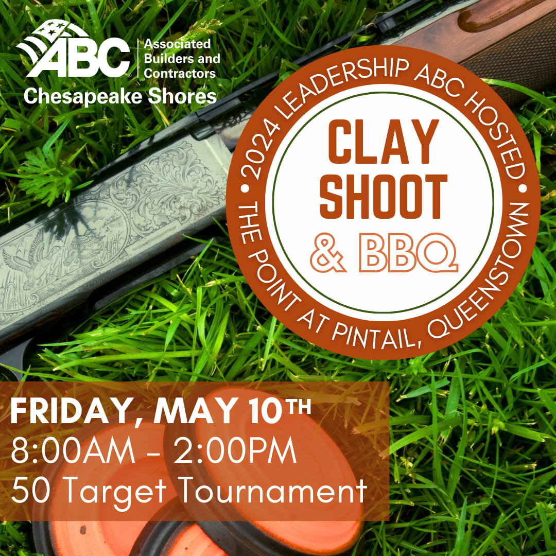 Join ABC Chesapeake Shores and the Leadership ABC participants for their annual hosted Clay Shoot & BBQ on Friday, May 10th at The Point at Pintail in Queenstown, MD! This event is open to chapter members and prospective members (must be accompanied by member in good standing).